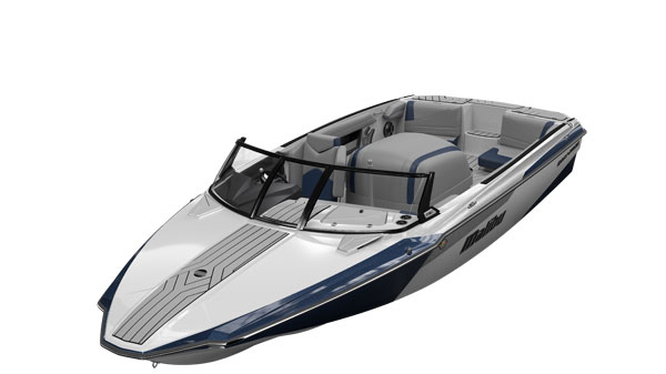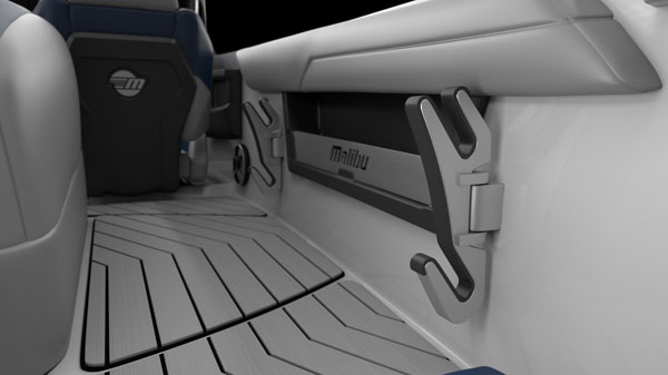 Malibu made a unique side buckle just forward of the driver that makes the boat look like an arrowhead from a bird’s-eye view. High-density marine-grade foam covers just about everything inside, and the gelcoat is available in metal-flake options that make this sleek hull look fast even when it’s at idle.