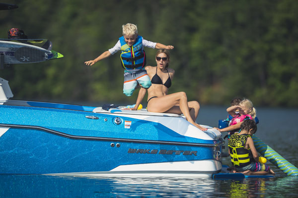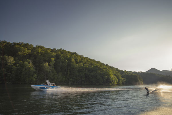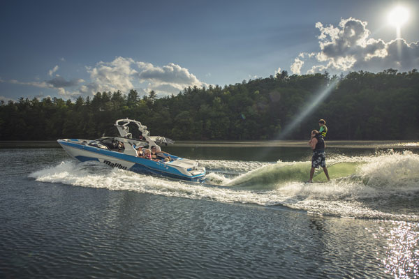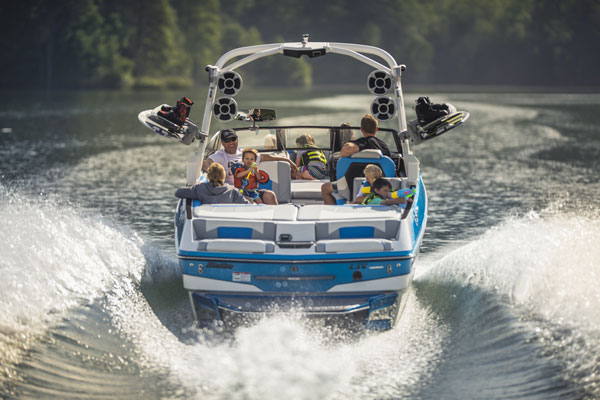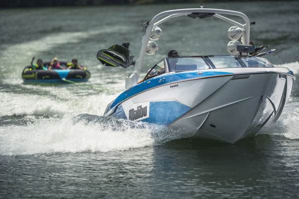 TRUE WAKE AND WAVE CREATION | Deploying the hydraulically actuated Power Wedge II is like adding up to 1,500 lbs (680 kgs) of additinal wake-creating water displacement. It happens at the tap of the driver's finger on the Command Center, or the surfer wearing the optional Malibu Surf Band wrist remote can adjust it right from the water.