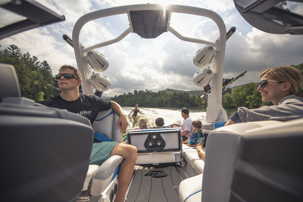 Allows you to control the music from the back of your Malibu. Located on the transom, so whether you are sitting on the swim platform or chilling on the sunpad, controlling your sounds is within easy reach.
